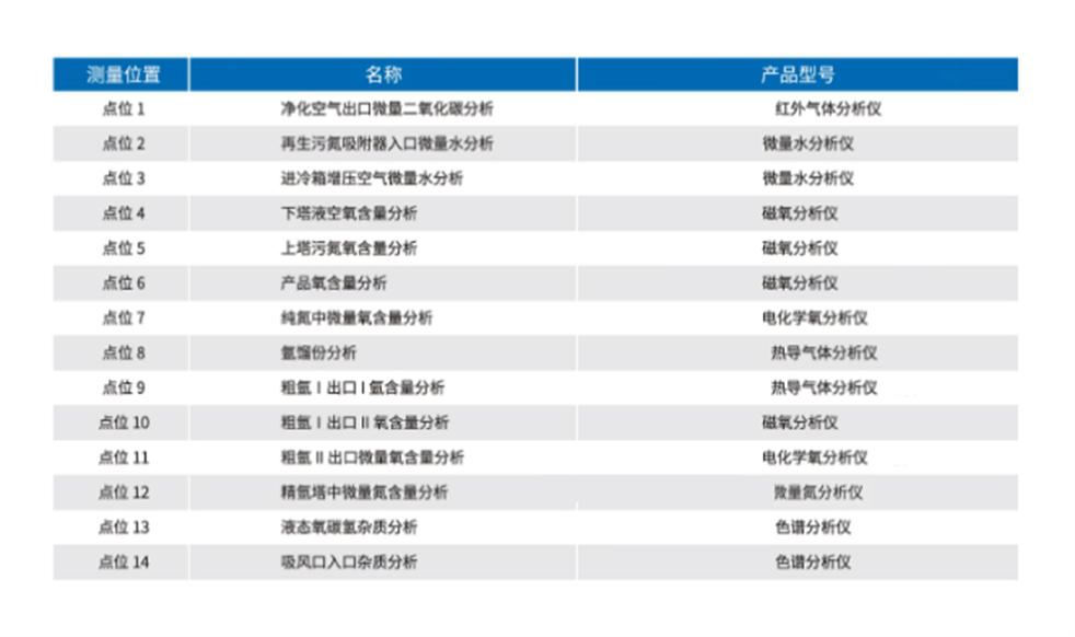 隨著空分行業對生產效率以及安全生產及產出質量的愈加重視,氣體分析儀(以下簡稱分析儀)在空分行業越來越多的得到了應用(如下圖為空分制備工藝流程在各點位所需用到的不同氣體分析儀器類型)。如何使用和維護好分析儀可以說是空分行業質量監控與安全防范的重要工作之一。但由于分析原理以及生產廠家的不同,導致分析儀的使用與維護具有一定的系統性與復雜性,本文就分析儀的使用進行一定的闡述。